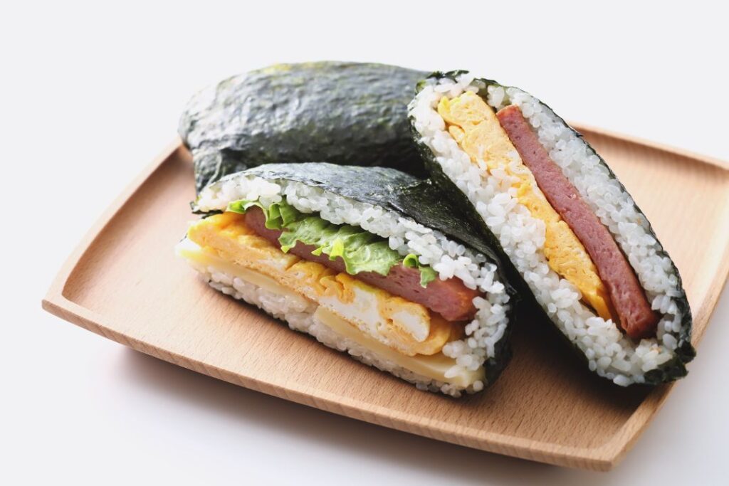 沖縄のソウルフード!ポークランチョンミート(スパム)と卵焼きをご飯で挟んだシンプルだけど美味しいおにぎり。朝ごはんやおやつに最高で、コンビニでも買えますが、専門店で出来たてを食べるのがおすすめです。