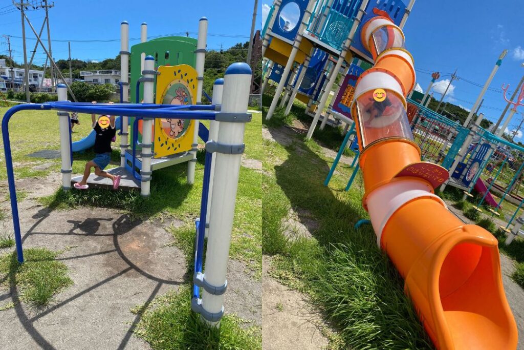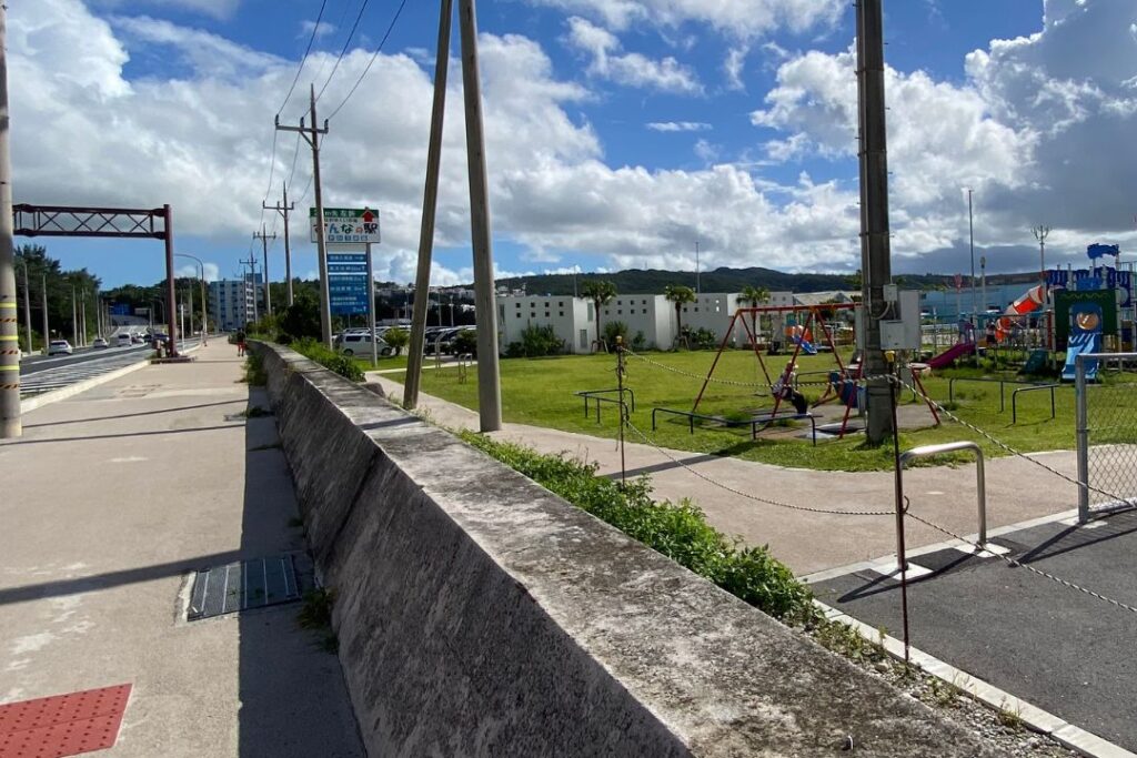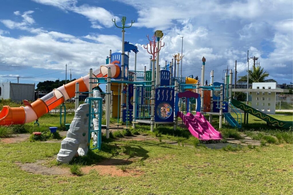 恩納村で子連れ旅行をしていると、観光やアクティビティの合間に『ちょっと子どもを遊ばせたいな』と感じることも…!そんなときに便利なのが前兼久漁港のすぐそばにある“遊具広場”。ローカルな雰囲気の小さな公園ですが、ブランコやすべり台でお子さまがのびのび遊べる、子連れ旅にちょうどいい立ち寄りスポットなんです♪